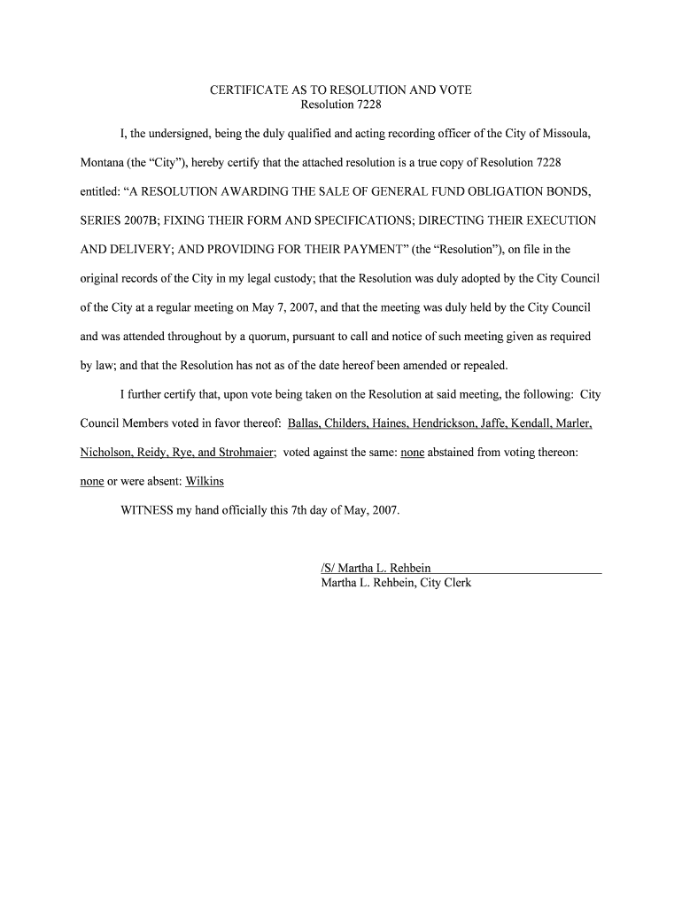 CERTIFICATE AS TO RESOLUTION AND VOTE Resolution 7228 I, the undersigned, being the duly qualified and acting recording officer of the City of Missoula, Montana (the City), hereby certify that the