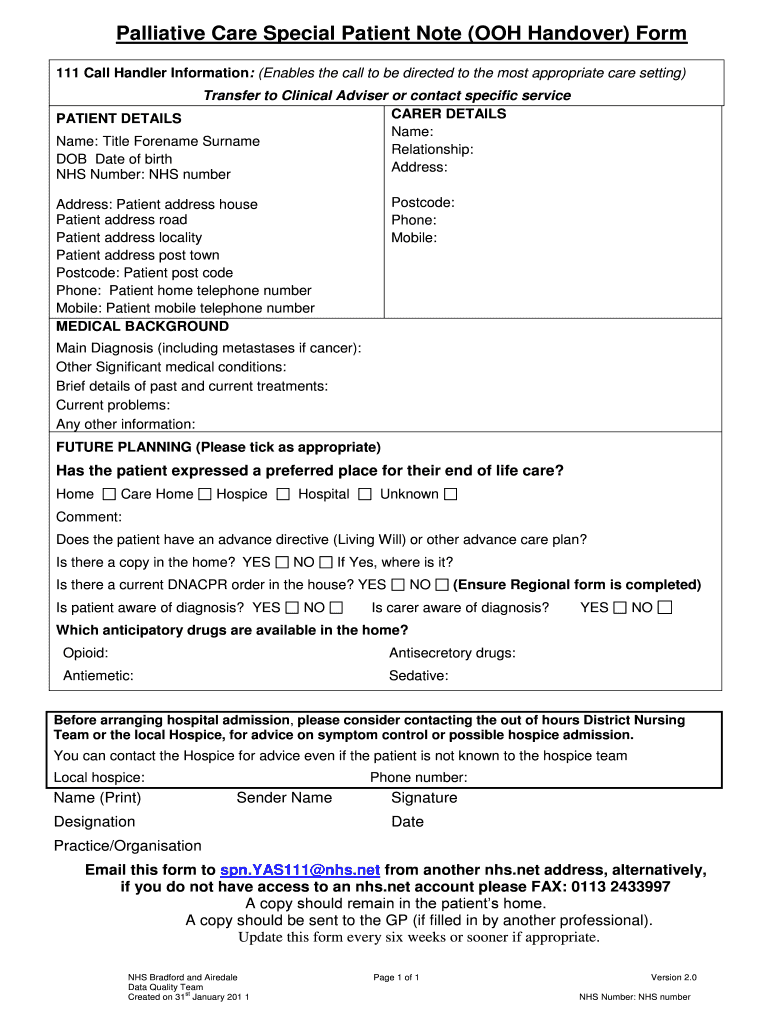 Get the free Palliative Care Handover Form - palliativecare bradford nhs