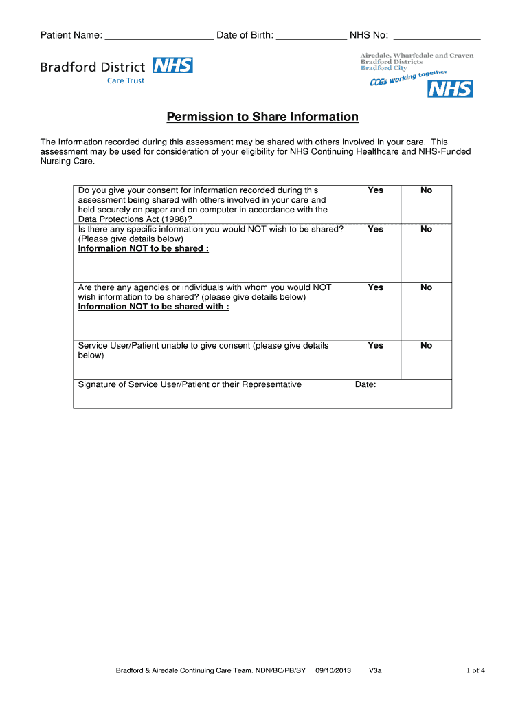 Patient Name: Date of Birth: NHS No: Permission to Share Information The Information recorded during this assessment may be shared with others involved in your care. This assessment may be used for
