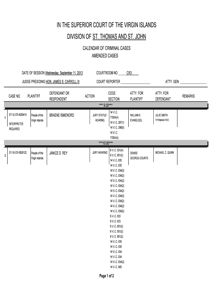 IN THE SUPERIOR COURT OF THE VIRGIN ISLANDS DIVISION OF ST. THOMAS AND ST. JOHN CALENDAR OF CRIMINAL CASES AMENDED CASES DATE OF SESSION Wednesday, September 11, 2013, COURTROOM NO CR3 JUDGE PRESIDING