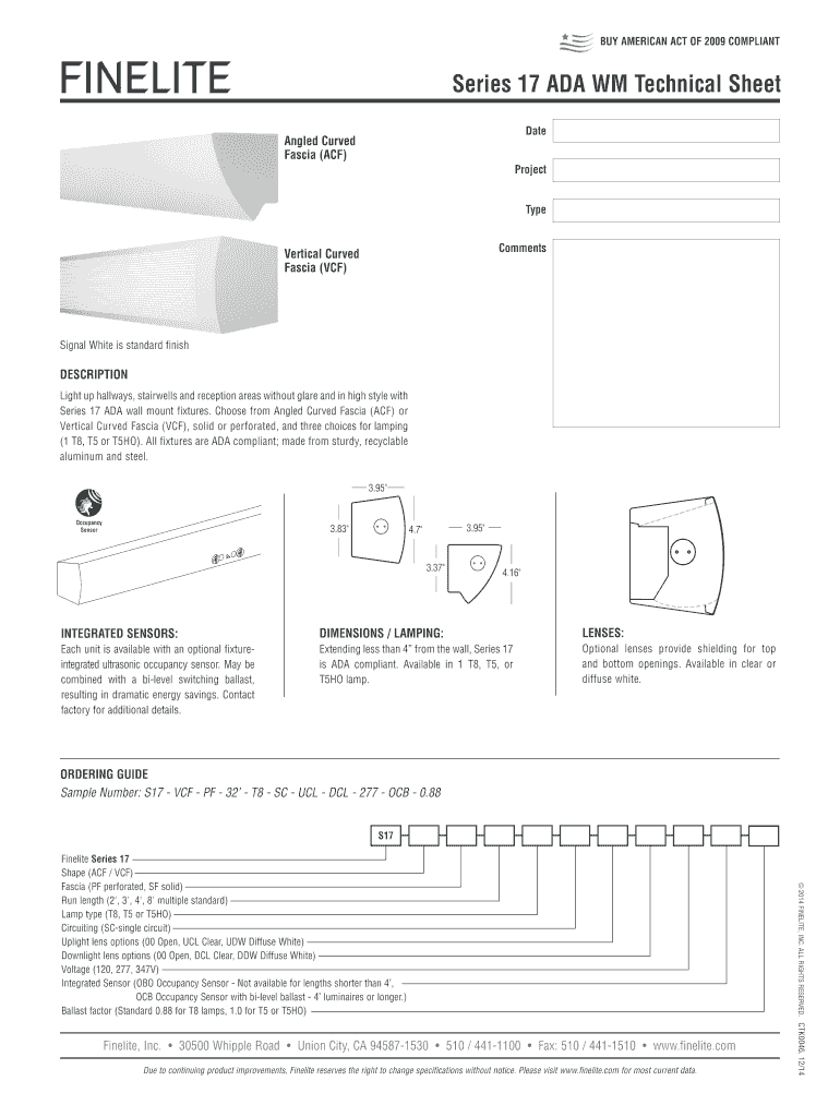 BUY AMERICAN ACT OF 2009 COMPLIANT FINITE Series 17 ADA WM Technical Sheet Date Angled Curved Fascia (ACF) Project Type Comments Vertical Curved Fascia (VCF) Signal White is standard finish DESCRIPTION