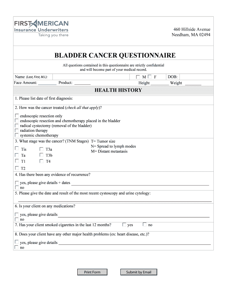 Ensure that you provide all the required information. Some questions may ask for personal details, medical history, lifestyle habits, or specific symptoms related to bladder cancer.