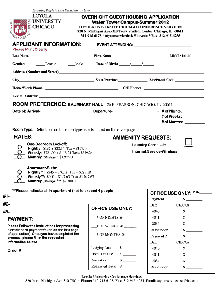 Water Tower Campus Summer 2012 Thank you for choosing Loyola University Chicago as your housing opportunity. We look forward to hosting you at our Water Tower Campus. Our room availability starts