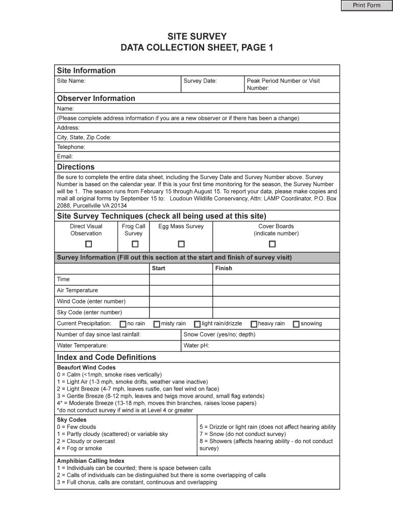 Print Form SITE SURVEY DATA COLLECTION SHEET, PAGE 1 Site Information Site Name: Survey Date: Peak Period Number or Visit Number: Observer Information Name: (Please complete address information if