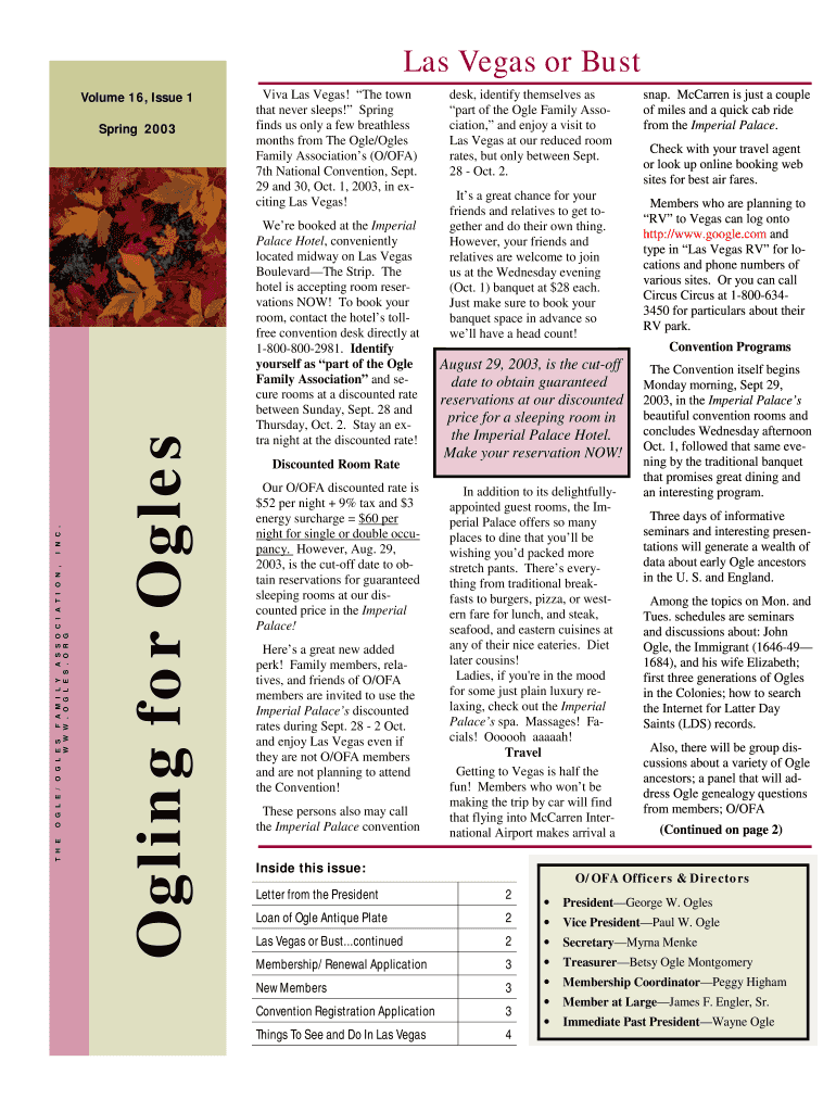 Las Vegas or Bust Volume 16, Issue 1 Ogling for Ogles T H E O G L E / O G L E S F A M I L Y A S S O C I A T I O N, W W W. O G L E S. O R G I N C. Spring 2003 Viva Las Vegas! The town that never sleeps!