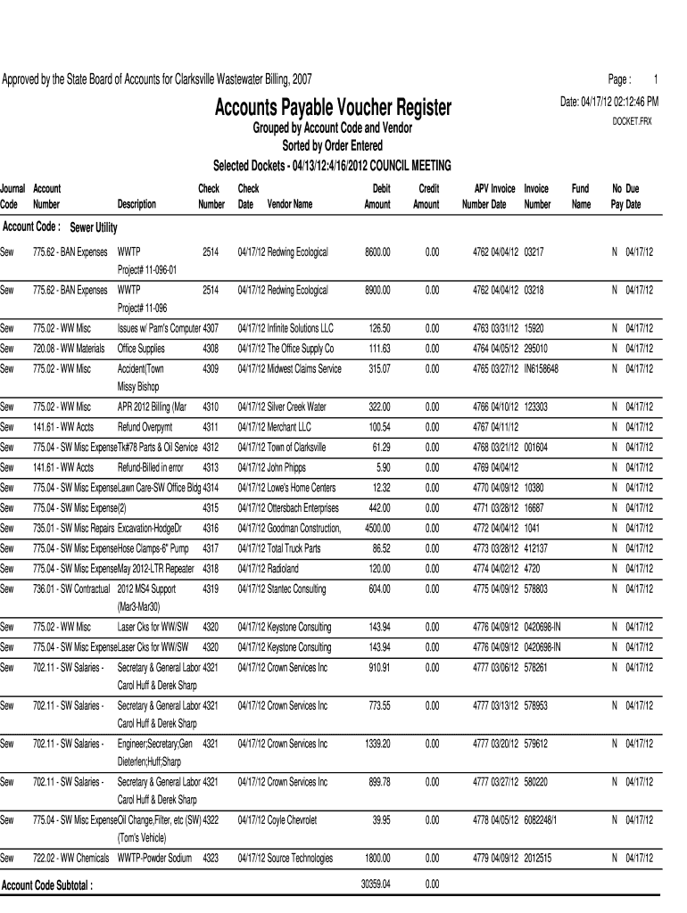Approved by the State Board of Accounts for Clarksville Wastewater Billing, 2007 Page : Accounts Payable Voucher Register DOCKET.FIX Grouped by Account Code and Vendor Sorted by Order Entered Selected