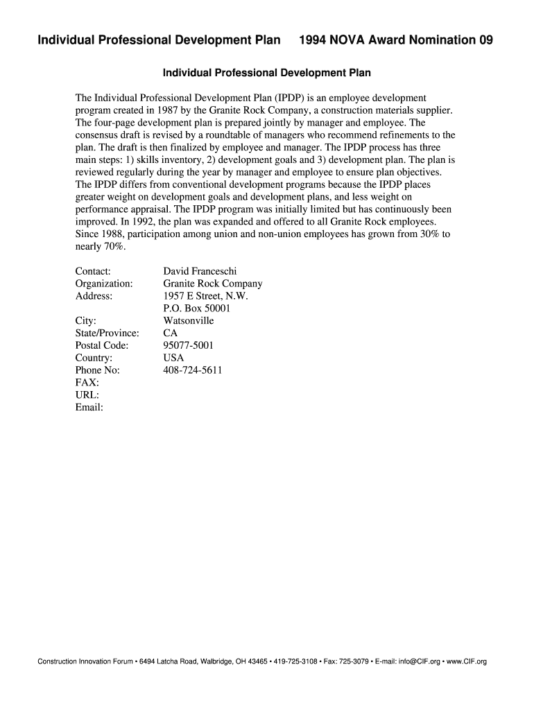 Individual Professional Development Plan 1994 NOVA Award Nomination 09 Individual Professional Development Plan The Individual Professional Development Plan (PDP) is an employee development program