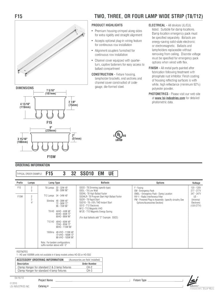 TWO, THREE, OR FOUR LAMP WIDE STRIP (T8/T12) F15 LSI INDOOR LIGHTING STRIPS PRODUCT HIGHLIGHTS Premium housing crimped along sides for extra rigidity and straight alignment Accepts optional plugin
