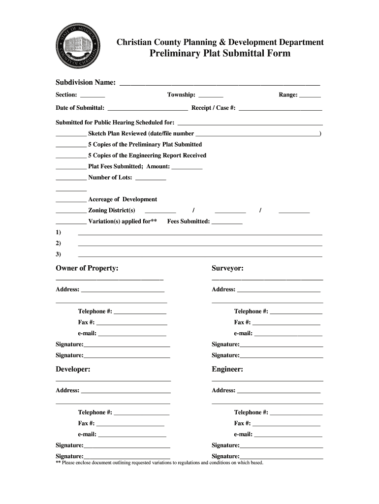 Christian County Planning & Development Department Preliminary Plat Submittal Form Subdivision Name: Section: Township: Range: Date of Submittal: Receipt / Case #: Submitted for Public Hearing Scheduled