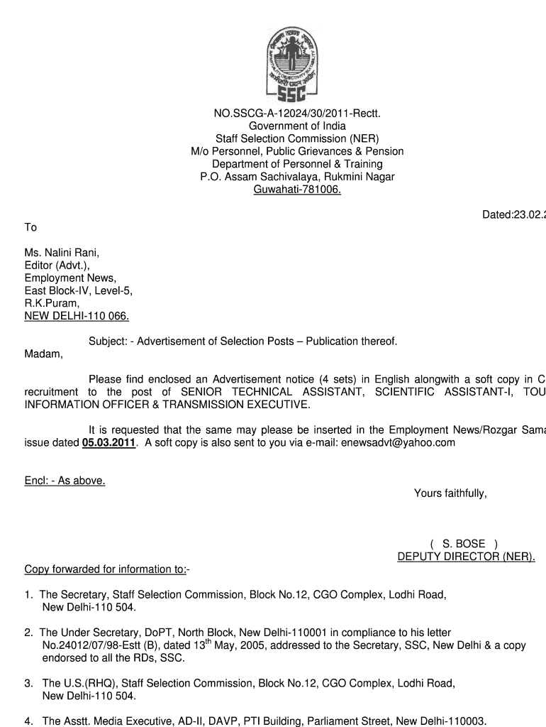 NO.SSCGA12024/30/2011Rectt. Government of India Staff Selection Commission (NER) M/o Personnel, Public Grievances & Pension Department of Personnel & Training P.O. Assam Sachivalaya, Rimini Nagar
