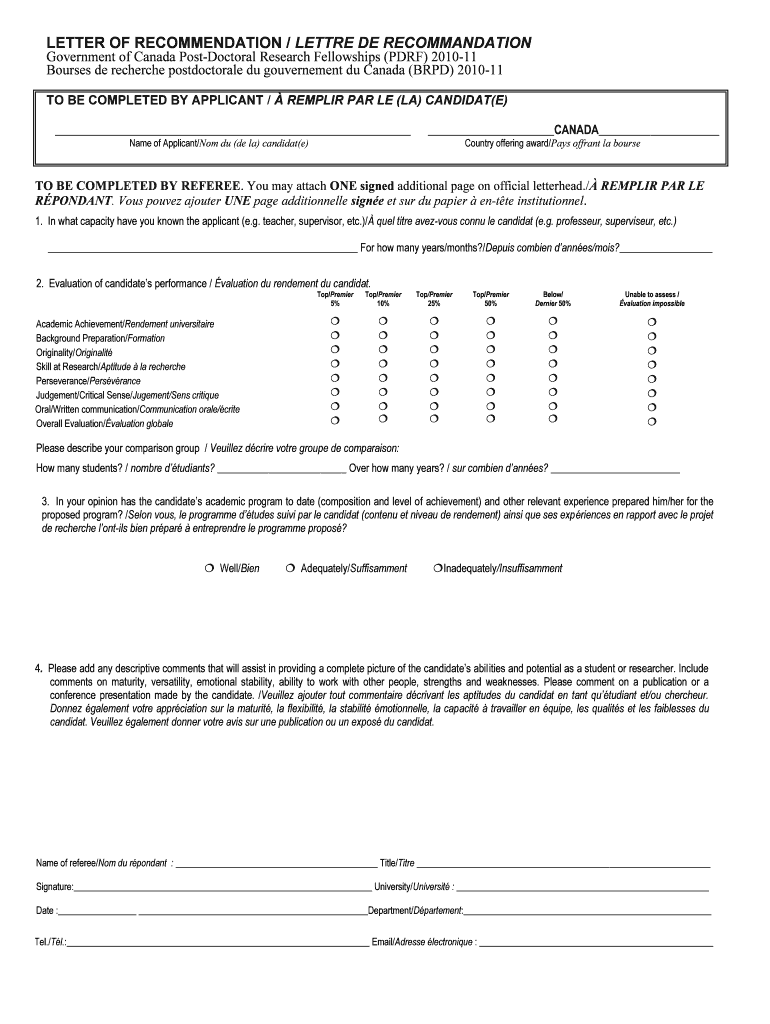 Get the free LETTER OF RECOMMENDATION LETTRE DE RECOMMANDATION Canadian Post-Doctoral Research Fe...