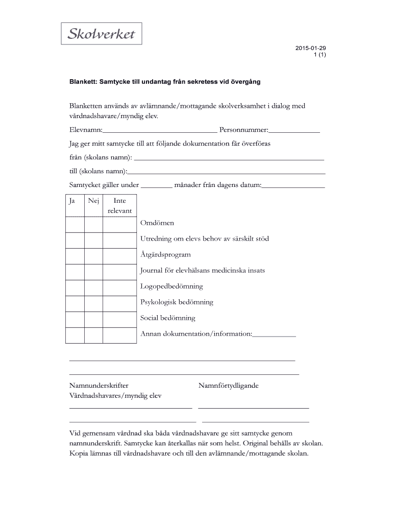 20150129 1 (1) Blanket: Samtycke till unwanted fan secretes vid verging Blanket ten amends av avlmnande/mottagande skolverksamhet i dialog med vrdnadshavare/mending elev. Eleven: Personnummer: Jagger