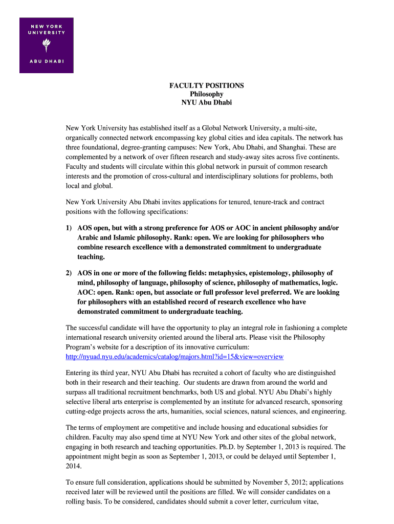 FACULTY POSITIONS Philosophy NYU Abu Dhabi New York University has established itself as a Global Network University, a multisite, organically connected network encompassing key global cities and