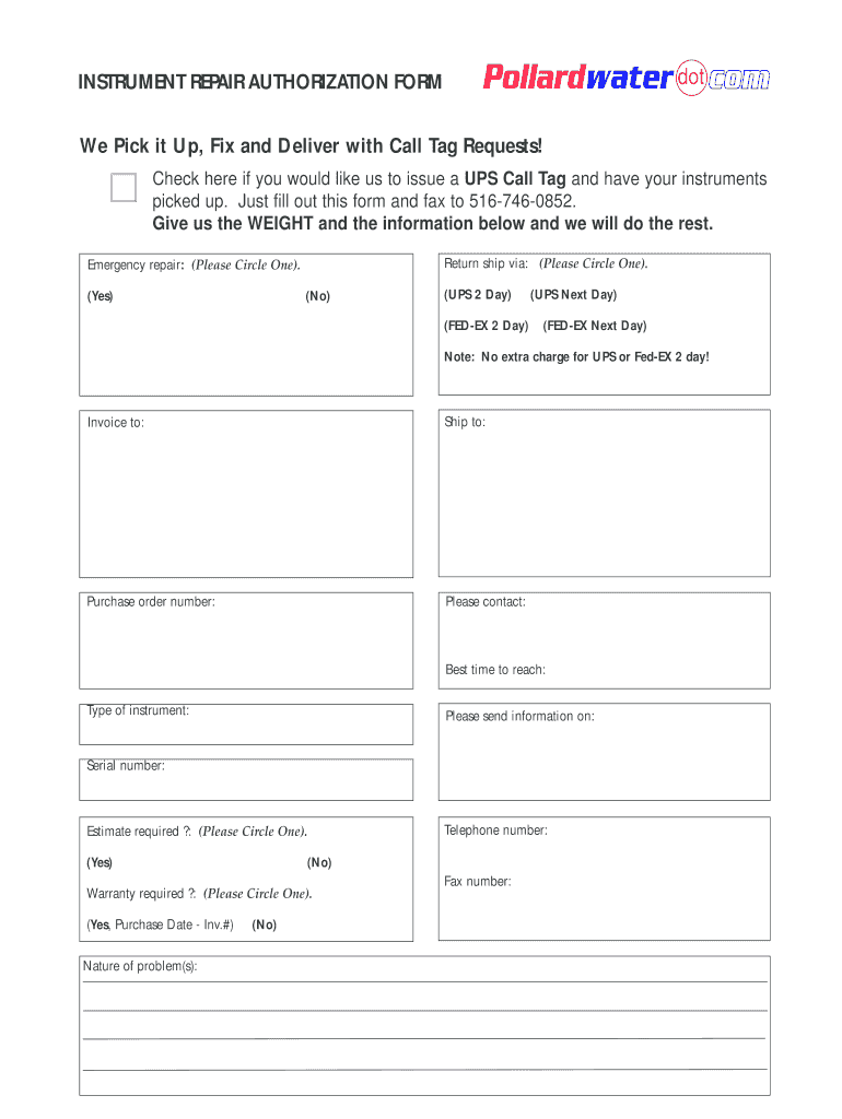 INSTRUMENT REPAIR AUTHORIZATION FORM We Pick it Up, Fix and Deliver with Call Tag Requests! Check here if you would like us to issue a UPS Call Tag and have your instruments picked up. Just fill out