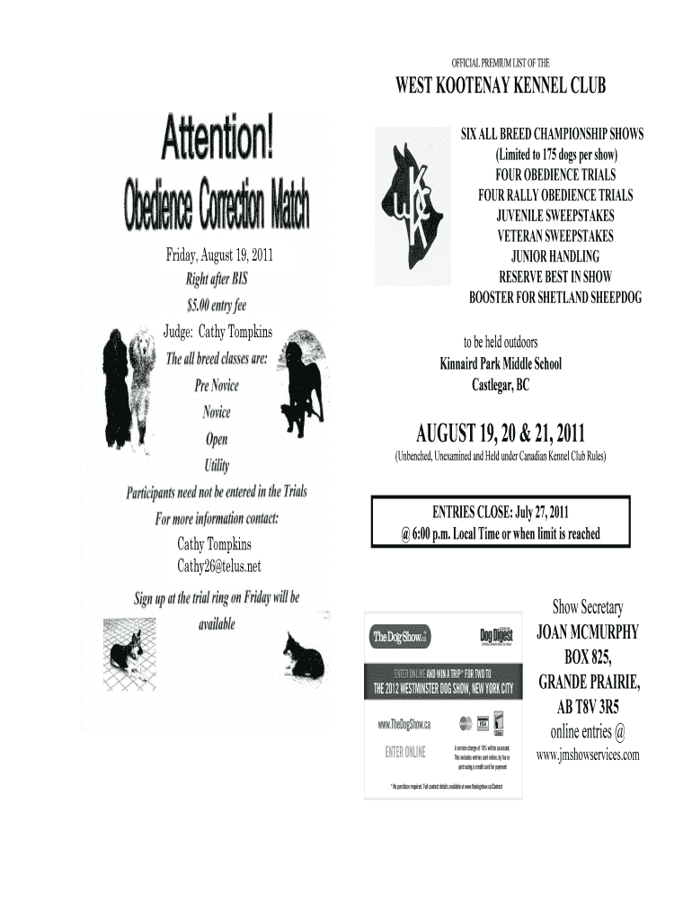 OFFICIAL PREMIUM LIST OF THE WEST KOOTENAI KENNEL CLUB Friday, August 19, 2011, Judge: Cathy Tompkins SIX ALL BREED CHAMPIONSHIP SHOWS (Limited to 175 dogs per show) FOUR OBEDIENCE TRIALS FOUR RALLY