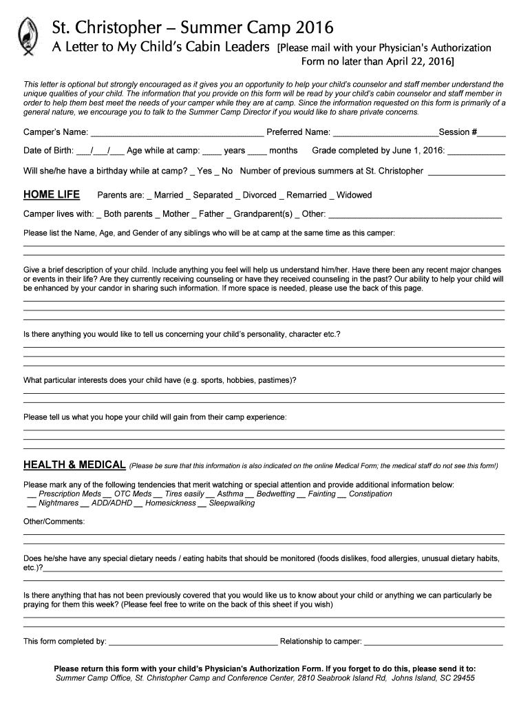 2016 St. Christopher Summer Camp 2016 My A Letter to My Child's Cabin Leaders with Please mail with your Physician's Authorization 2016 Form no later than April 22, 2016, This letter is optional but