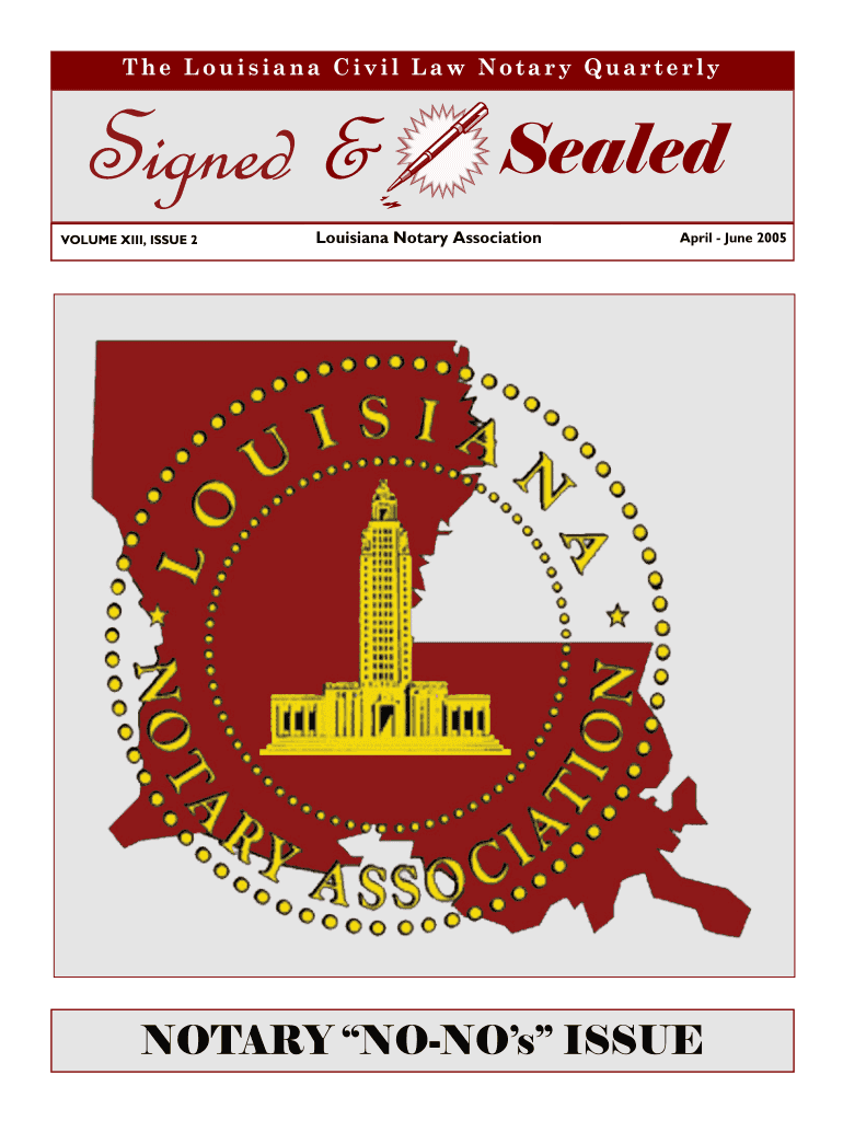The Louisiana Civil Law Notary Quarterly Signed & VOLUME XIII, ISSUE 2 Sealed Louisiana Notary Association April June 2005 NOTARY Sonos ISSUE Come join us for The Flavor of Louisiana 10th Annual LNA