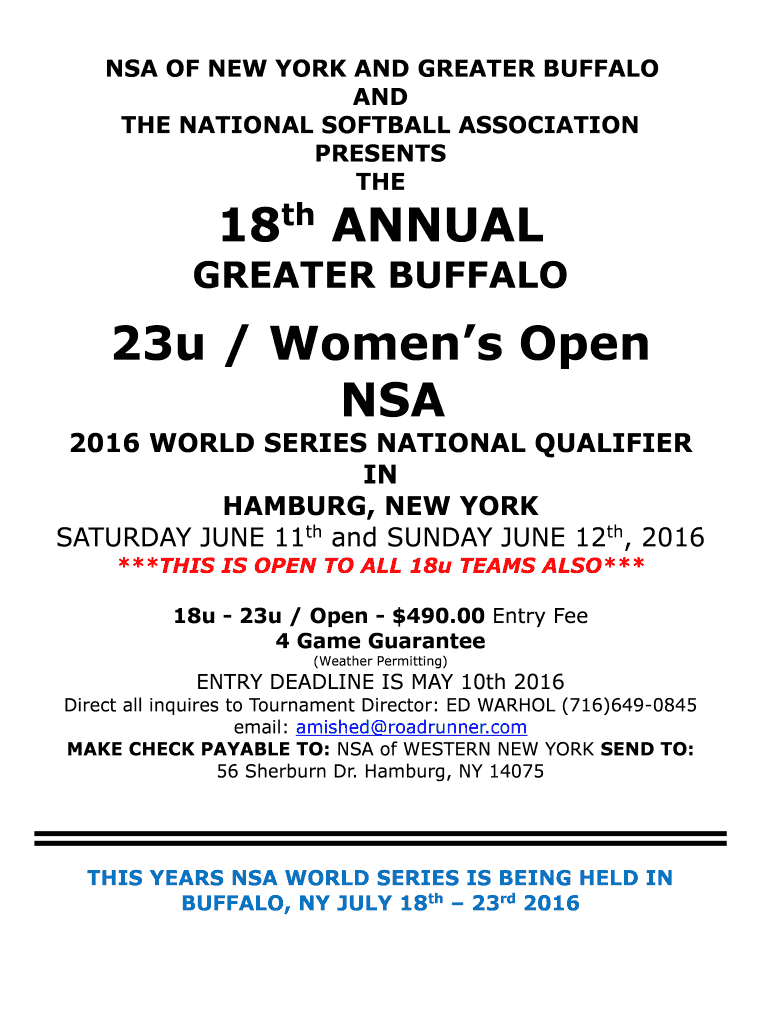 NSA OF NEW YORK AND GREATER BUFFALO AND THE NATIONAL SOFTBALL ASSOCIATION PRESENTS THE 18th ANNUAL GREATER BUFFALO 23u / Women's Open NSA 2016 WORLD SERIES NATIONAL QUALIFIER IN HAMBURG, NEW YORK