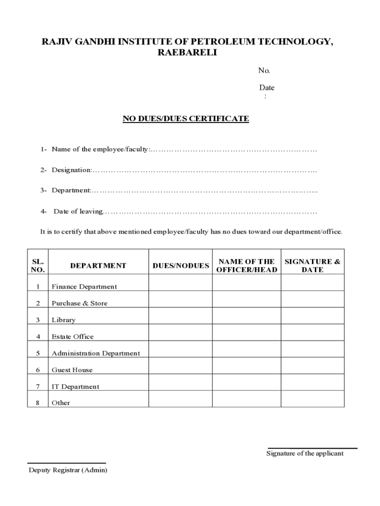 RAJIV GANDHI INSTITUTE OF PETROLEUM TECHNOLOGY, RAEBARELI No. Date :NO DUES/DUES CERTIFICATE1 Name of the employee/faculty: 2 Designation:. 3 Department:. 4 Date of leaving It is to