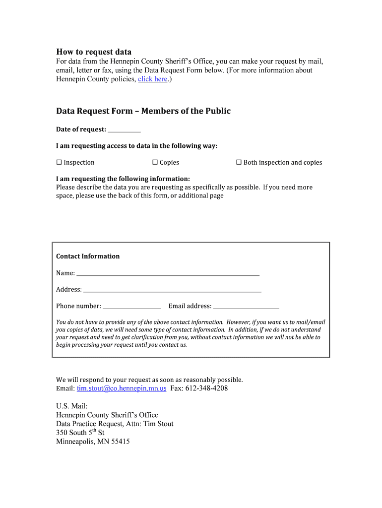 How to request data For data from the Hennepin County Sheriffs Office, you can make your request by mail, email, letter or fax, using the Data Request Form below. (For more information about Hennepin