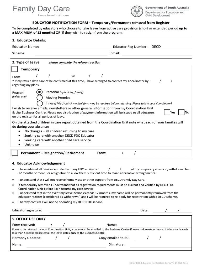 EDUCATOR NOTIFICATION FORM Temporary/Permanent removal from Register To be completed by educators who choose to take leave from active care provision (short or extended period up to a MAXIMUM of 12