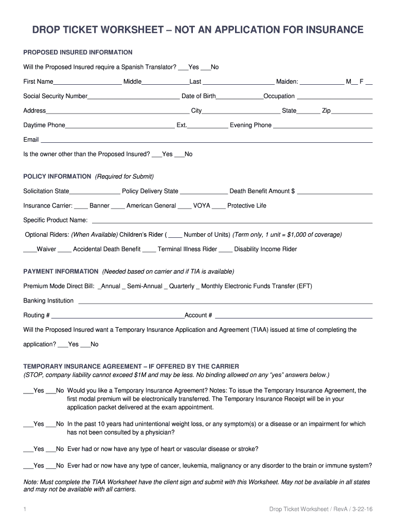 Get the free Drop Ticket Worksheet NOT AN APPLICATION FOR INSURANCE