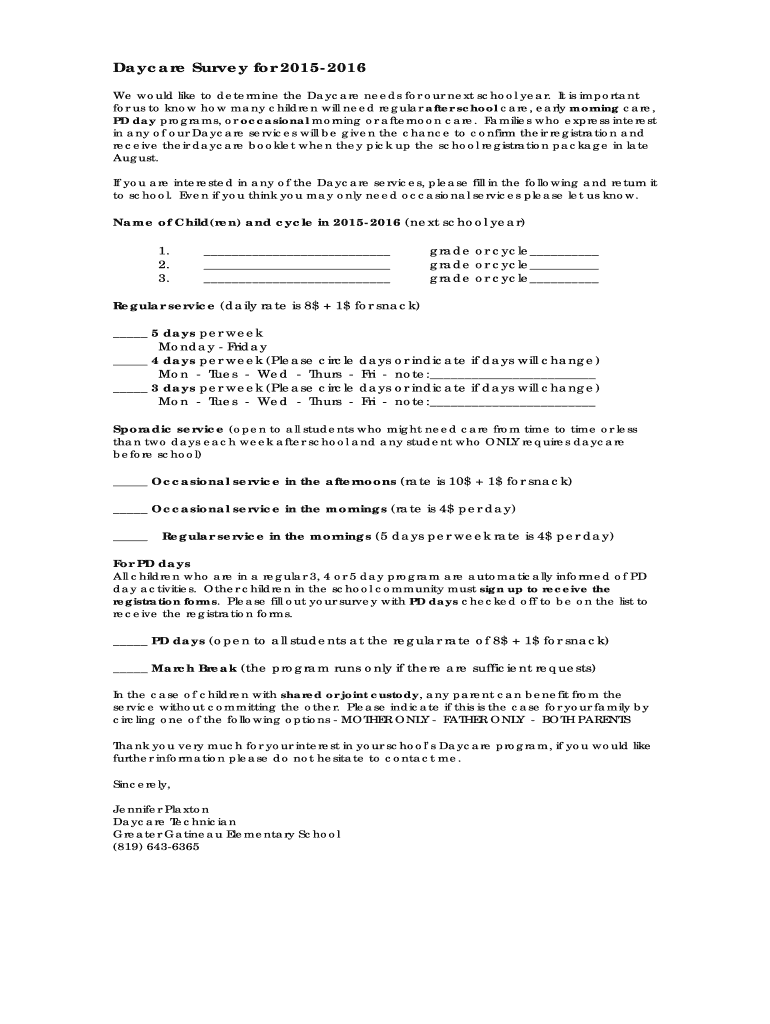 Get the free Daycare Survey for 20152016 - wqsb qc