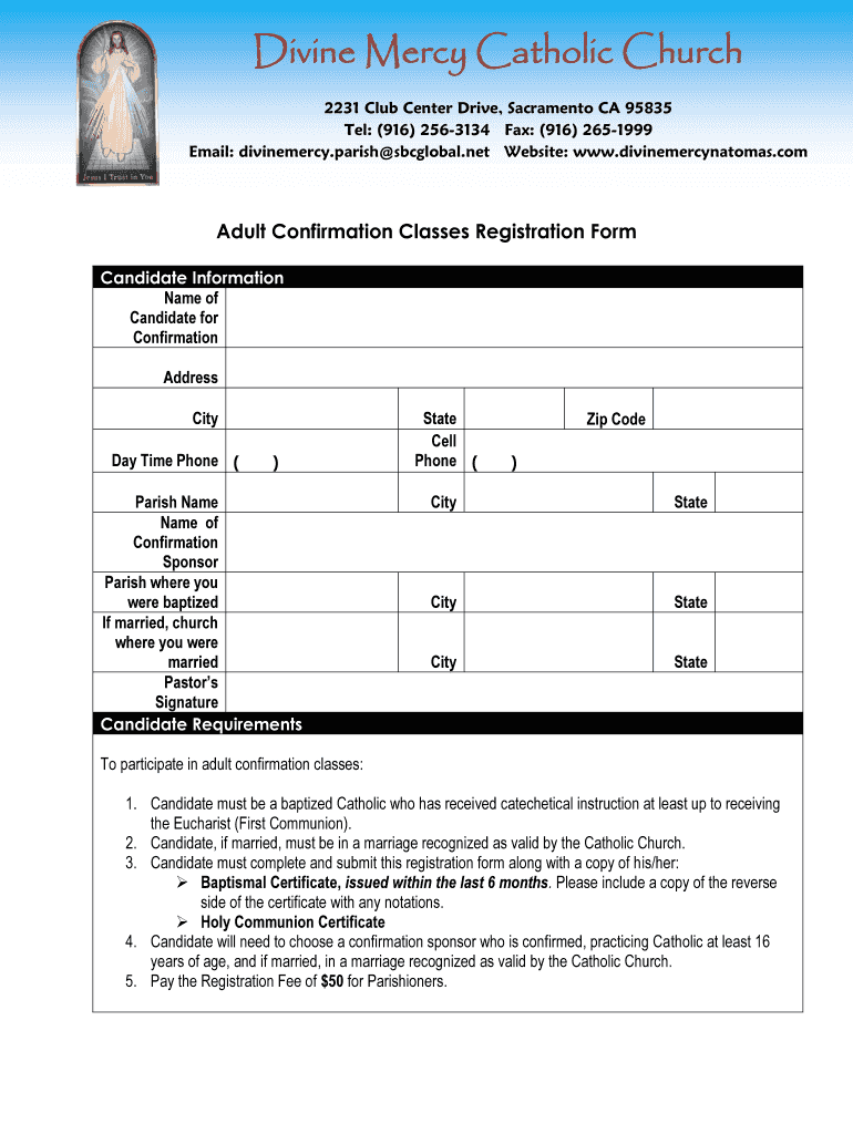 Divine Mercy Catholic Church 2231 Club Center Drive, Sacramento CA 95835 Tel: (916) 2563134 Fax: (916) 2651999 Email: divine mercy. Parish global.net Website: www.divinemercynatomas.com Adult Confirmation