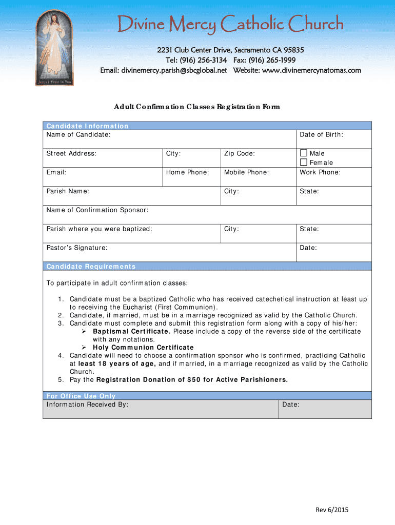 Divine Mercy Catholic Church 2231 Club Center Drive, Sacramento CA 95835 Tel: (916) 2563134 Fax: (916) 2651999 Email: divine mercy. Parish global.net Website: www.divinemercynatomas.com Adult Confirmation