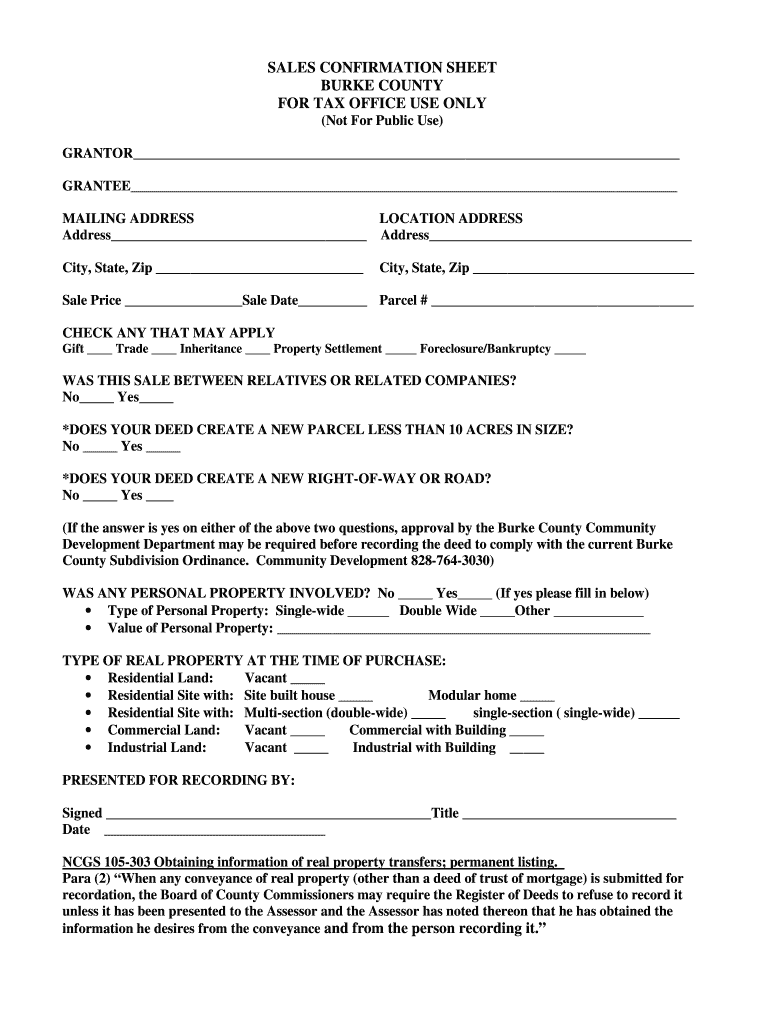 SALES CONFIRMATION SHEET BURKE COUNTY FOR TAX OFFICE USE ONLY (Not For Public Use) GRANTER GRANTEE MAILING ADDRESS LOCATION ADDRESS Address Address City, State, Zip City, State, Zip Sale Price Sale