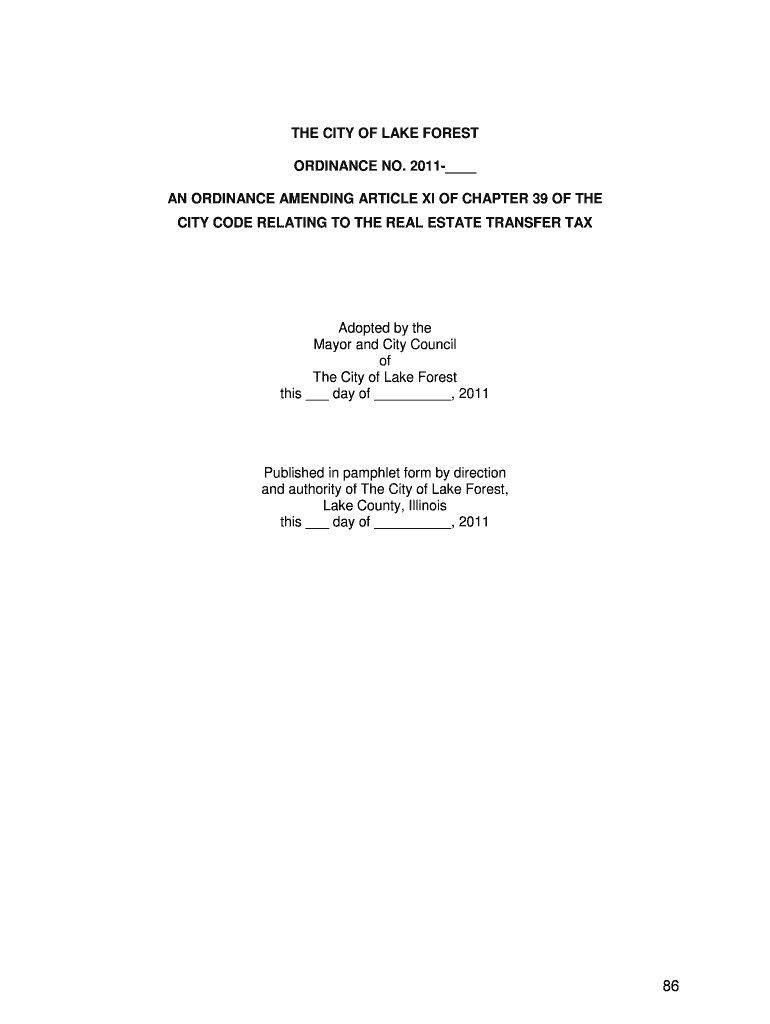 THE CITY OF LAKE FOREST ORDINANCE NO. 2011 AN ORDINANCE AMENDING ARTICLE XI OF CHAPTER 39 OF THE CITY CODE RELATING TO THE REAL ESTATE TRANSFER TAX Adopted by the Mayor and City Council of The City