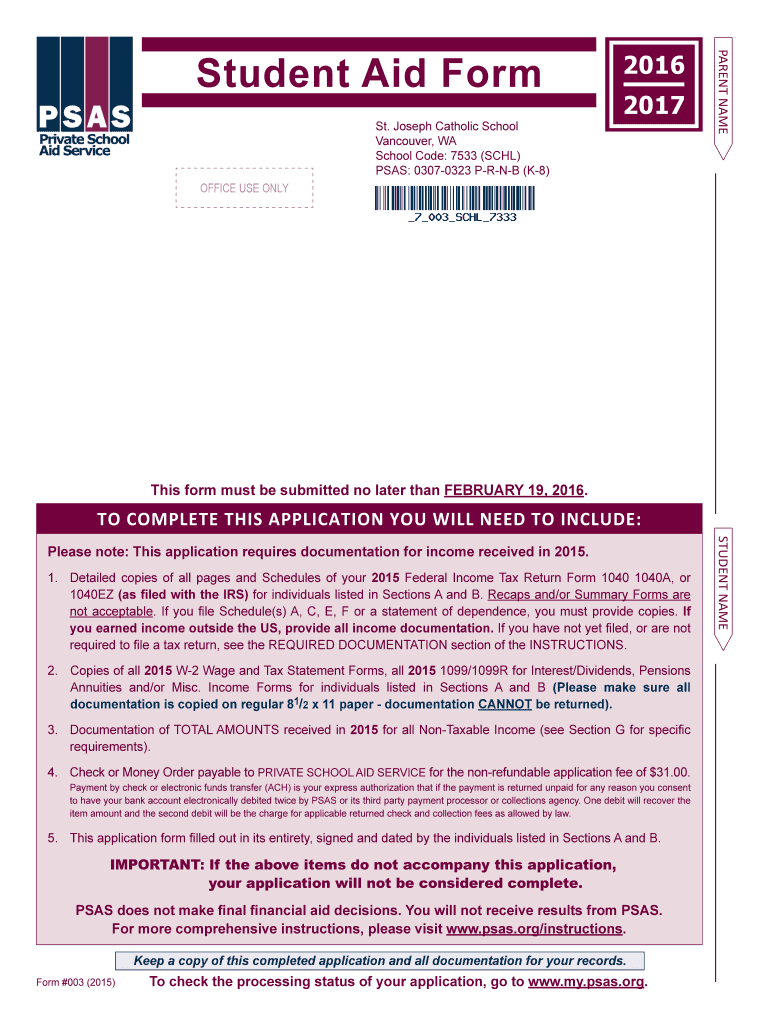 Get the free Student Aid Form 2016 - stjoevanschoolorg