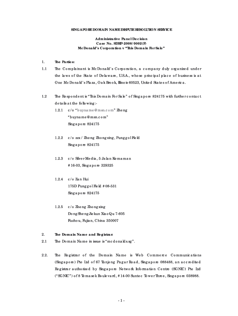 SINGAPORE DOMAIN NAME DISPUTE RESOLUTION SERVICE Administrative Panel Decision Case No. SDRP-2008/0002(F) McDonald s Corporation v This Domain For Sale 1. The Parties: 1.1 The Complainant is McDonald