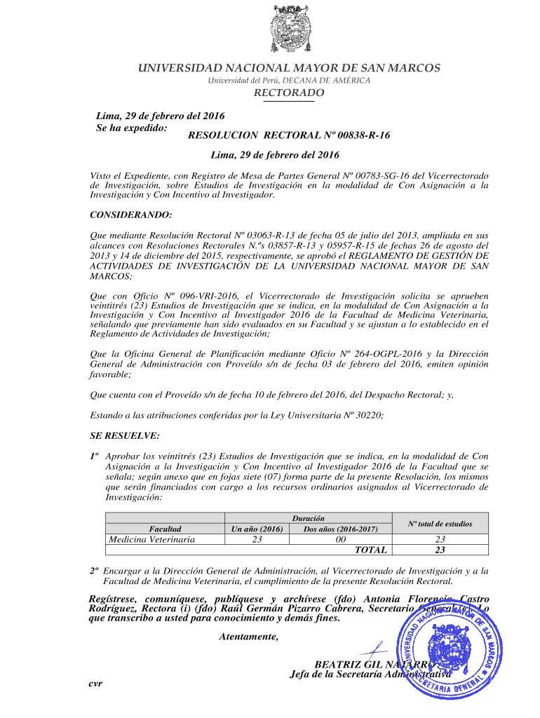 Obtener el gratis RESOLUCION RECTORAL N 00838-R-16 - vrinvestigacion unmsm edu