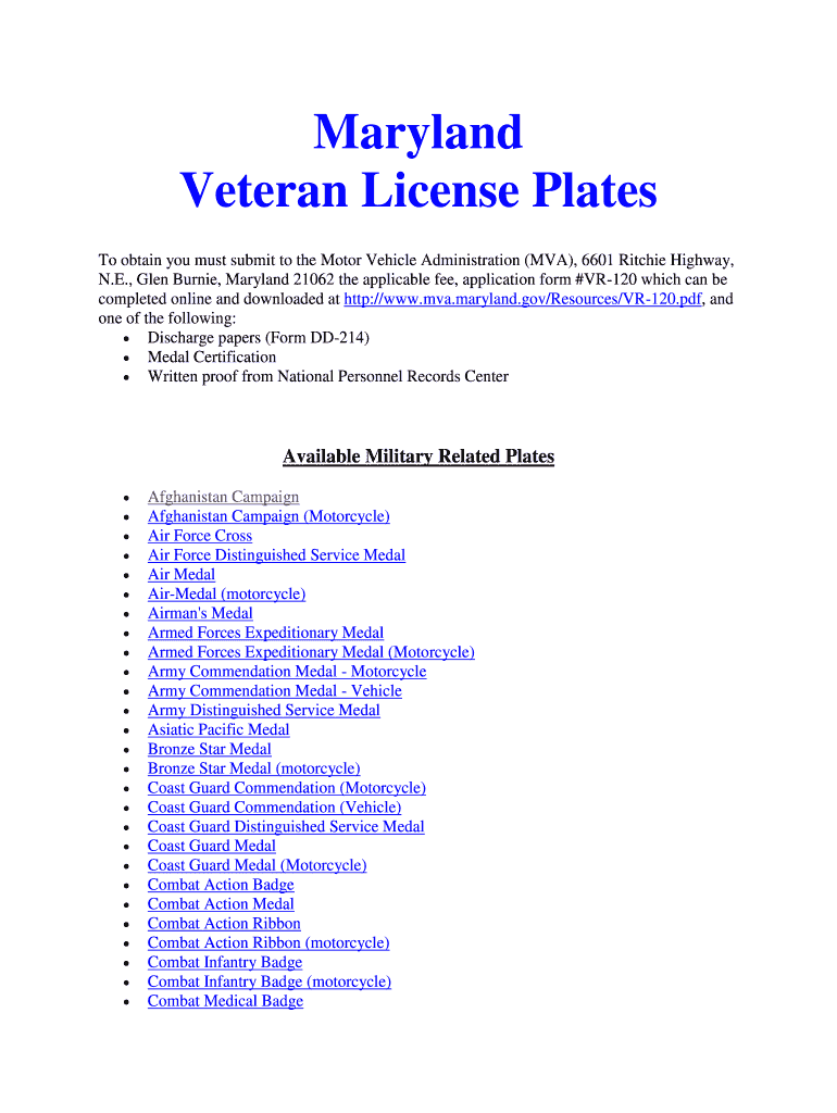 Maryland Veteran License Plates To obtain you must submit to the Motor Vehicle Administration (MVA), 6601 Ritchie Highway, N.E., Glen Burnie, Maryland 21062 the applicable fee, application form #VR120