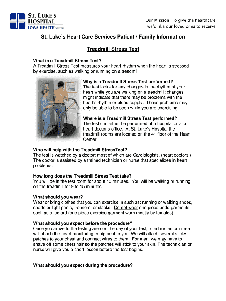 Our Mission: To give the healthcare we'd like our loved ones to receive St. Luke's Heart Care Services Patient / Family Information Treadmill Stress Test What is a Treadmill Stress Test? A Treadmill