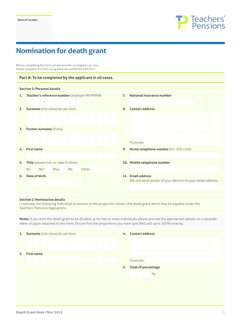 Date of receipt: Nomination for death grant Before completing this form, please read the accompanying notes. Please complete this form using black ink and BLOCK CAPITALS. Part A: To be completed by