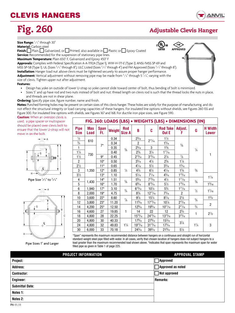 CLEVIS HANGERS Fig. 260 Adjustable Clevis Hanger Size Range: 12 through 30 Material: Carbon steel Finish: q Plain, q Galvanized, or q Primed, also available in q Plastic or q Epoxy Coated Service: