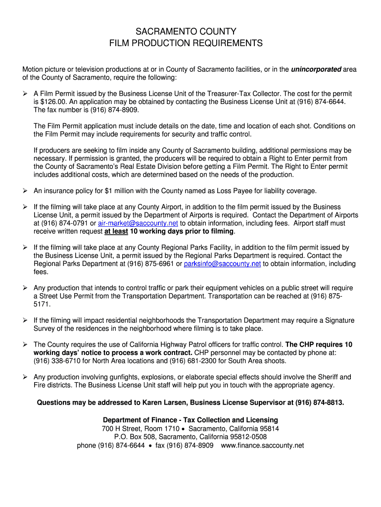 SACRAMENTO COUNTY FILM PRODUCTION REQUIREMENTS Motion picture or television productions at or in County of Sacramento facilities, or in the unincorporated area of the County of Sacramento, require