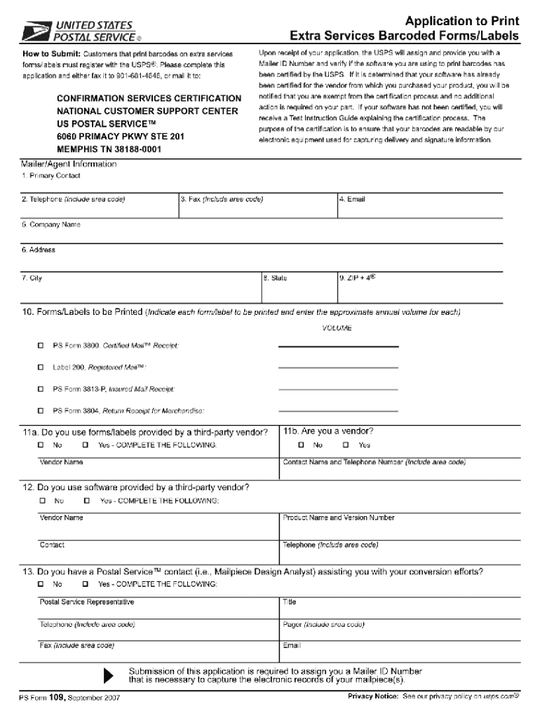 Application to Print Extra Services Barcoded Forms/Labels How to Submit: Customers that print barcodes on extra services forms/labels must register with the USPS. Please complete this application