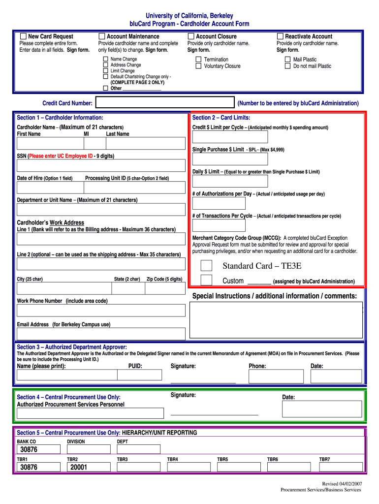 University of California, Berkeley placard Program Cardholder Account Form New Card Request Please complete entire form. Enter data in all fields. Sign form. Account Maintenance Provide cardholder