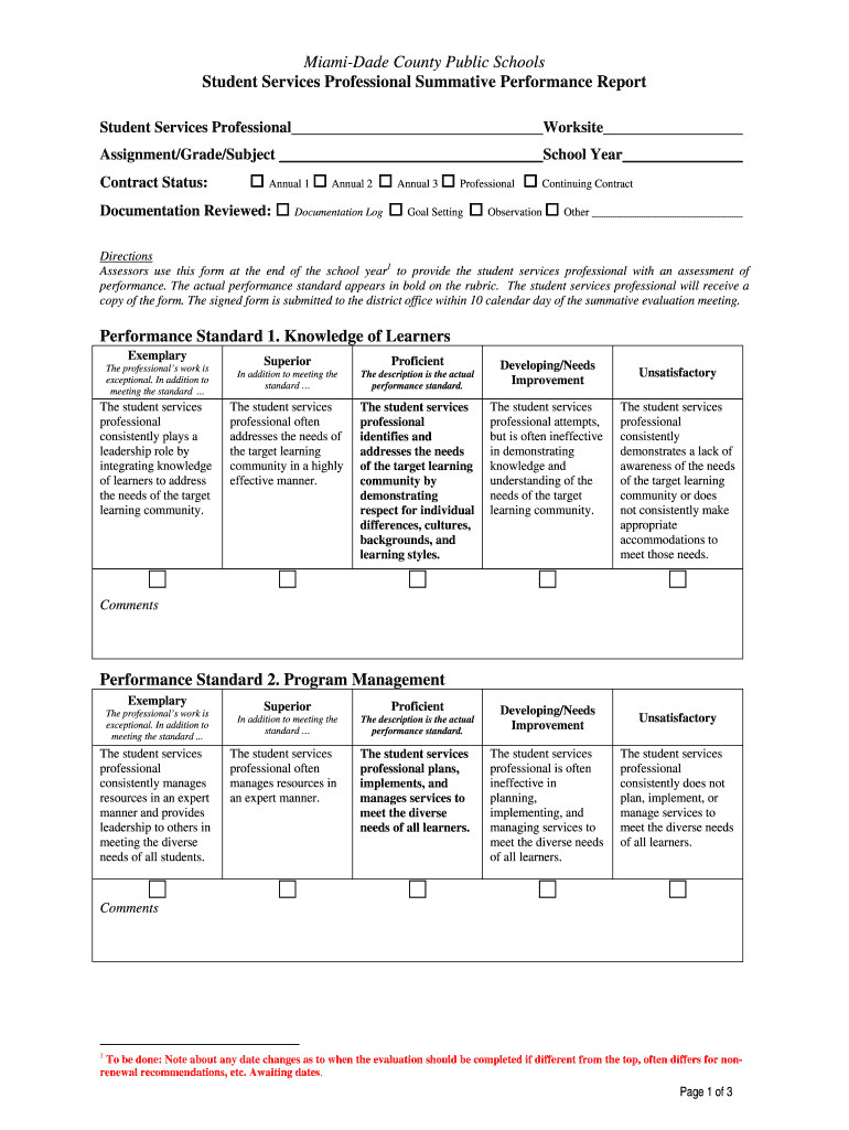 Miami-Dade County Public Schools Student Services Professional Summative Performance Report Student Services Professional Worksite Assignment/Grade/Subject School Year Contract Status: Annual 1 Documentation