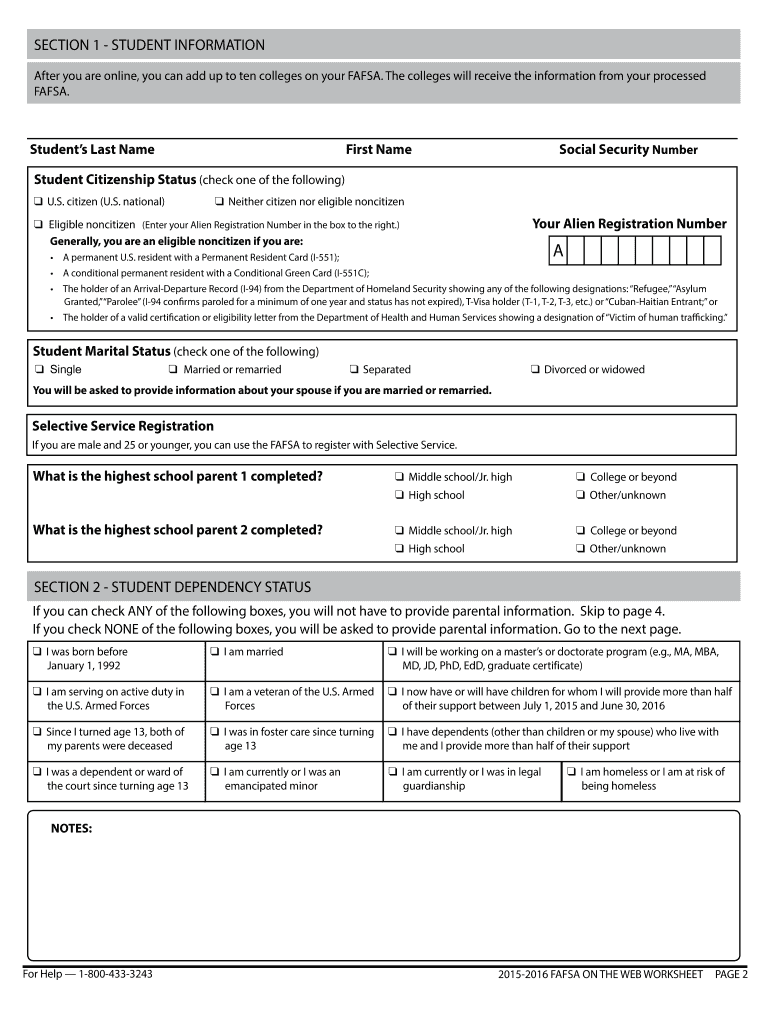 2015 2016 FAFSA on the Web Worksheet www.fafsa.gov APPLICATION DEADLINES Federal Deadline June 30, 2016, State Aid Deadlines See below. DO NOT MAIL THIS WORKSHEET. The FAFSA on the Web Worksheet provides