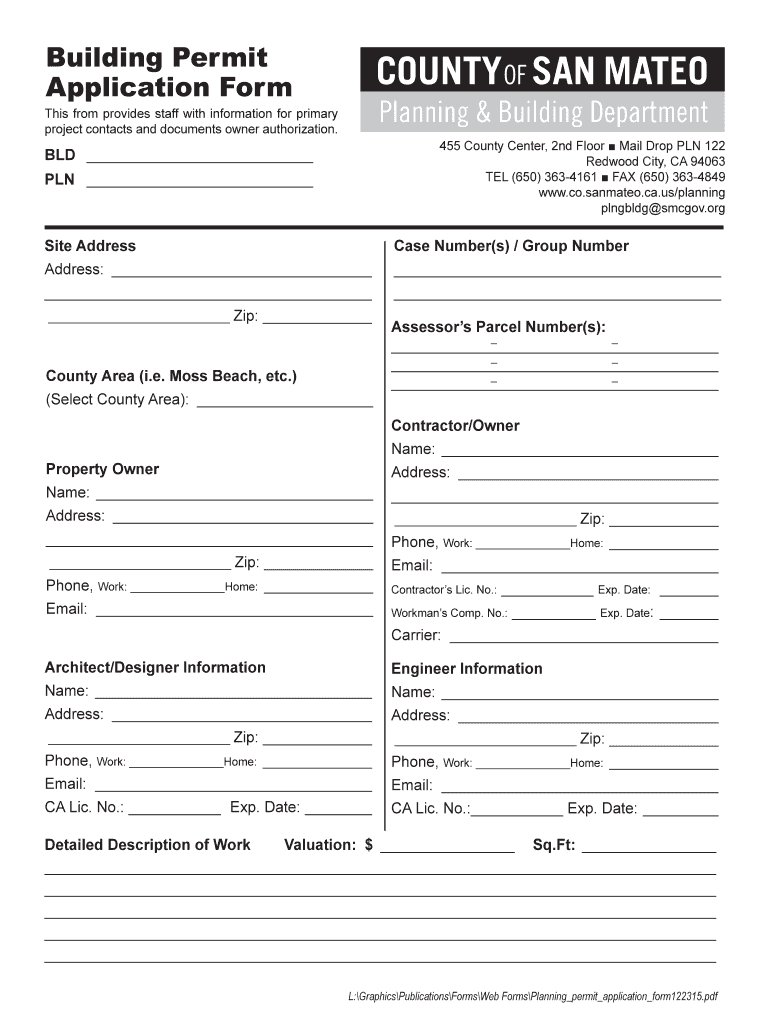 Building Permit Application Form Planning & Building Department This from provides staff with information for primary project contacts and documents owner authorization. 455 County Center, 2nd Floor