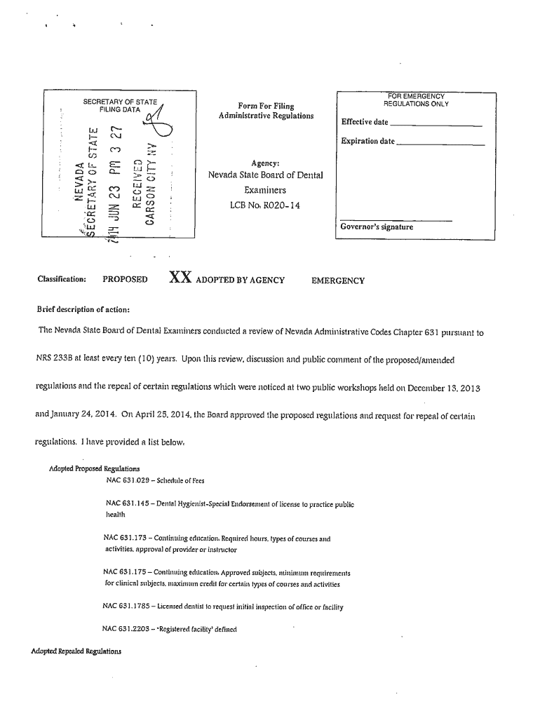 SECRETARY OF STATE FILING DATA 5 w I, FOR EMERGENCY REGULATIONS ONLY Fl or i ING Effective date Administrative Regulations C)) Expiration date Agency: C Nevada State Board of Dental OC ORM N, Fan