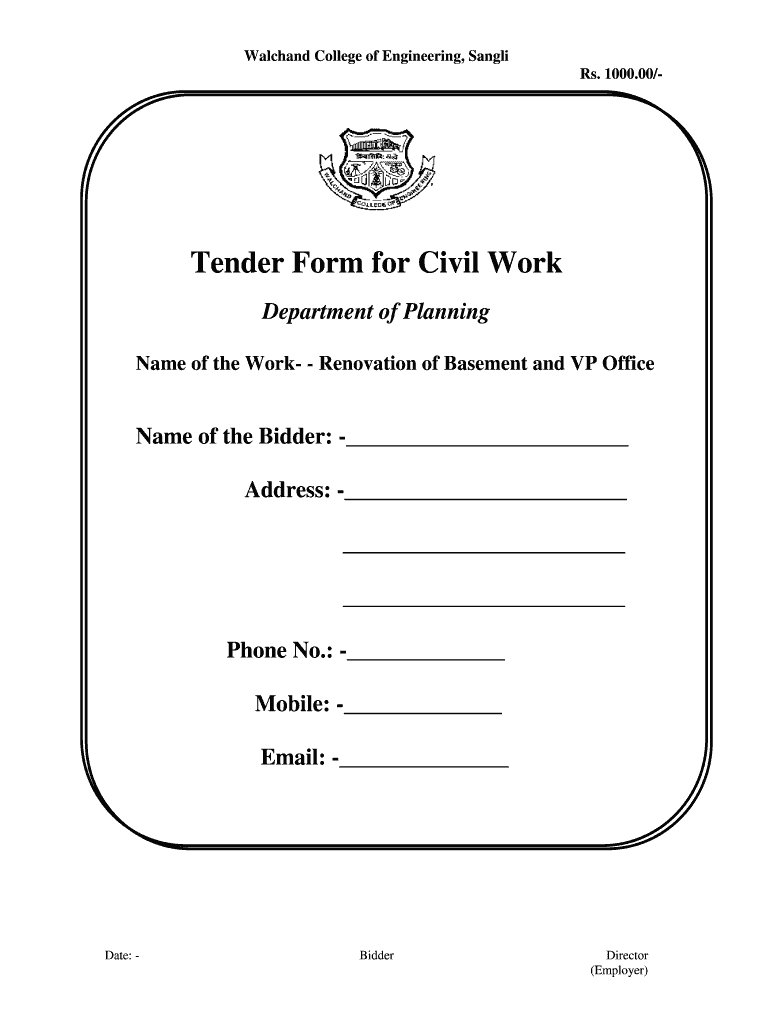 Watchband College of Engineering, Single Rs. 1000.00/ Tender Form for Civil Work Department of Planning Name of the Work Renovation of Basement and VP Office Name of the Bidder: Address: Phone No.:
