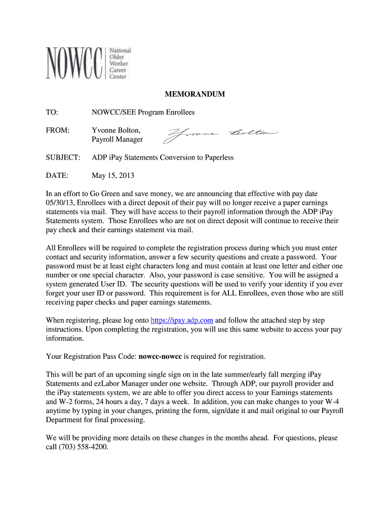 Payroll ManagerSUBJECT:ADP pay Statements Conversion to PaperlessDATE:May 15, 2013In an effort to Go Green and save money, we are announcing