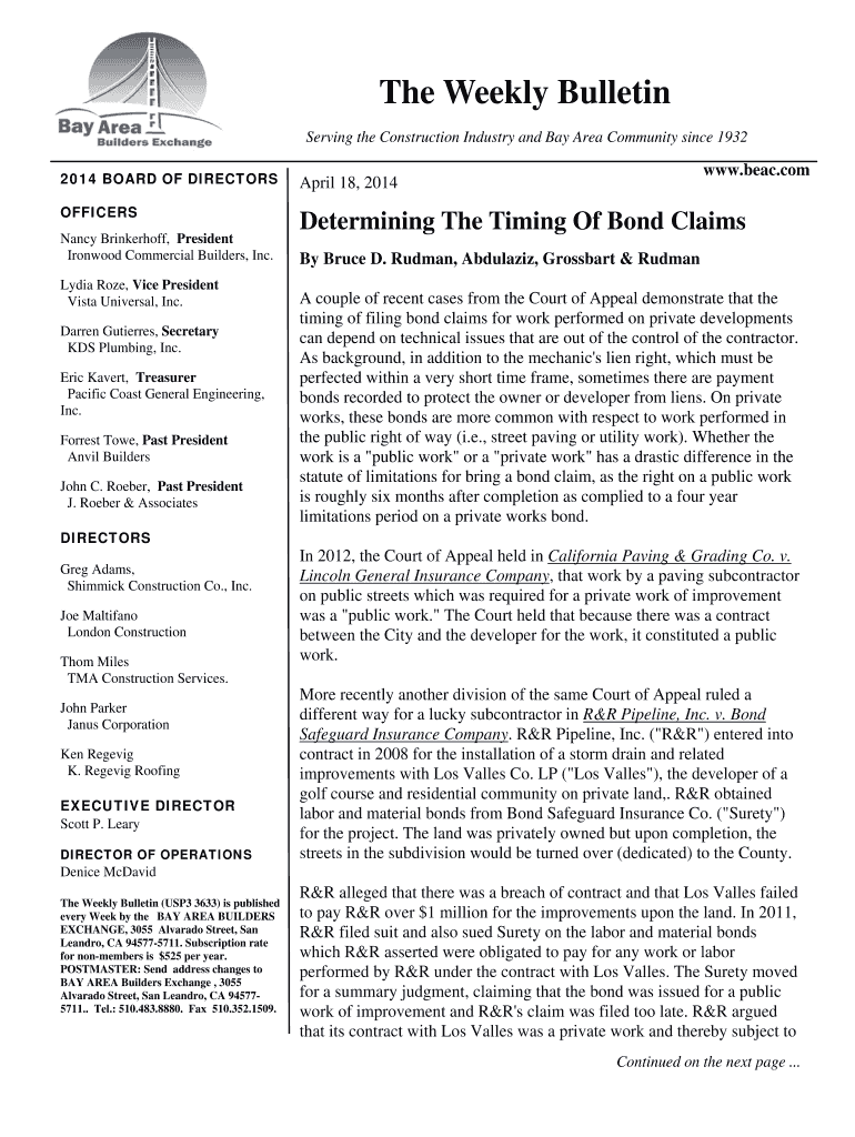 The Weekly Bulletin Serving the Construction Industry and Bay Area Community since 1932 2014 BOARD OF DIRECTORS OFFICERS Nancy Brinkerhoff, President Ironwood Commercial Builders, Inc. Lydia Role,