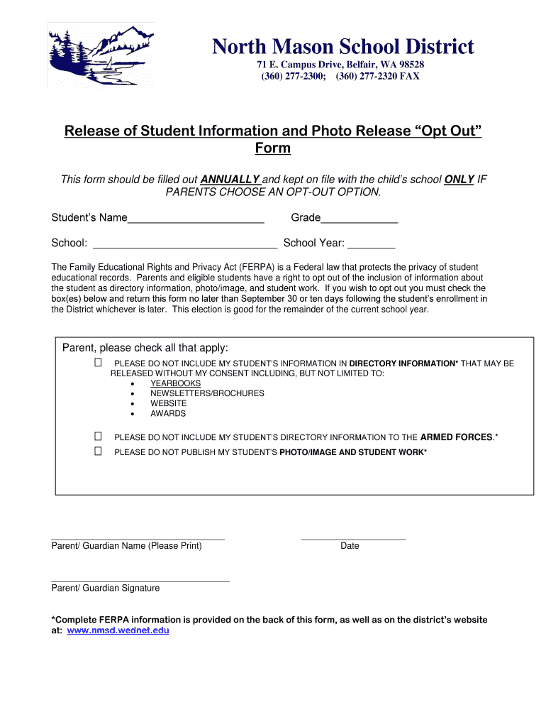 North Mason School District 71 E. Campus Drive, Welfare, WA 98528 (360) 2772300; (360) 2772320 FAX Release of Student Information and Photo Release Opt-Out Form This form should be filled out ANNUALLY