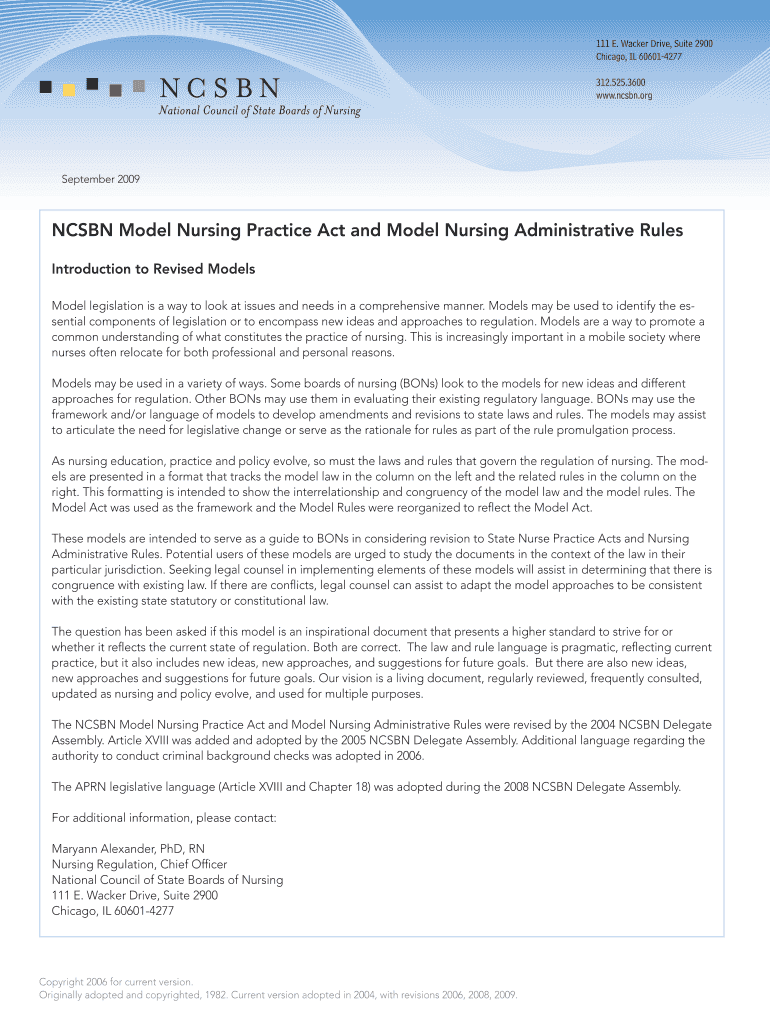 September 2009NCSBN Model Nursing Practice Act and Model Nursing Administrative Rules